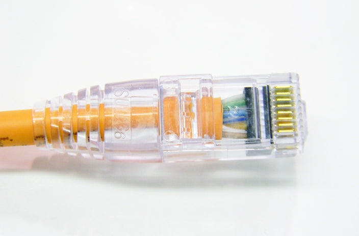 Datcom Assured Canadian Manufactured 8P8C (RJ45) 568A/ISDN paired Category 6 plus stranded orange patch cable x 15 feet. With clear low profile easy squeeze strain relief boots. Plus 4dB headroom exceeds Category 6 standards.