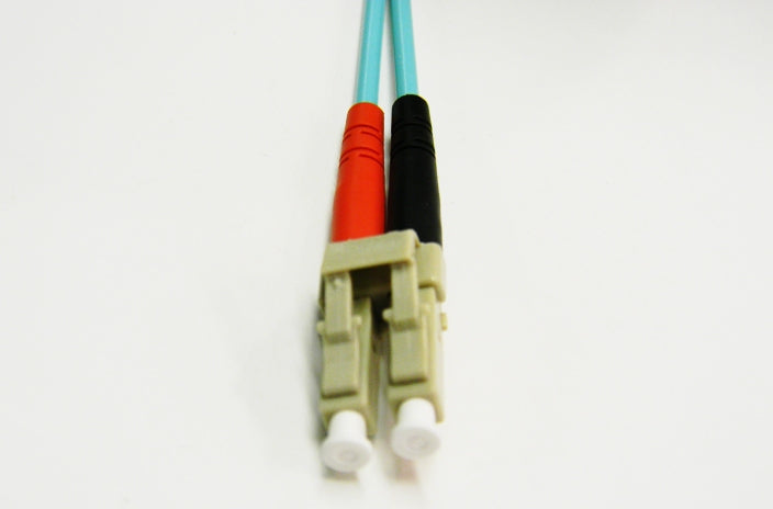 Datcom Assured Canadian Manufactured LC to LC 50/125um OM3 Multimode duplex OFNR riser rated aqua coloured 3mm jacketed fiber patch cord by 6.56ft. Features a duplex shrouded connector and printed test results. Maximum -.30 dB insertion loss, exceeds belcore specifications.