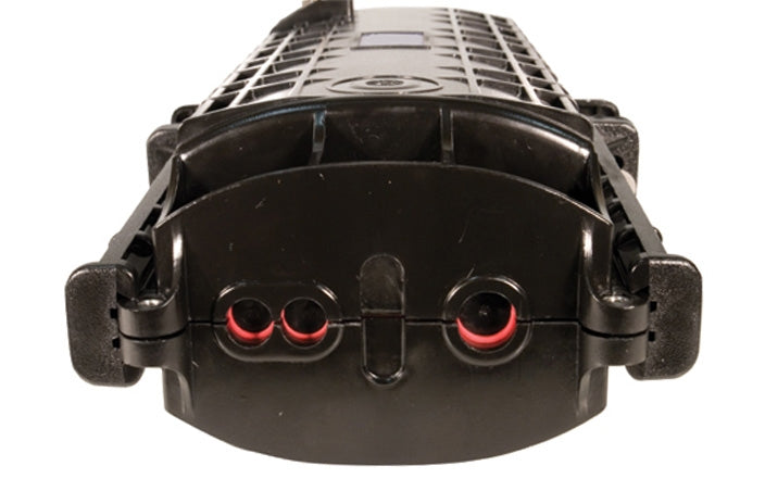 Datcom Realm 72 fiber outdoor splice enclosure. Includes splice trays, heat shrinkable protective sleeves, 6 cable ports (3 each side), tooling and labels, aerial hooks and cable management accessories.