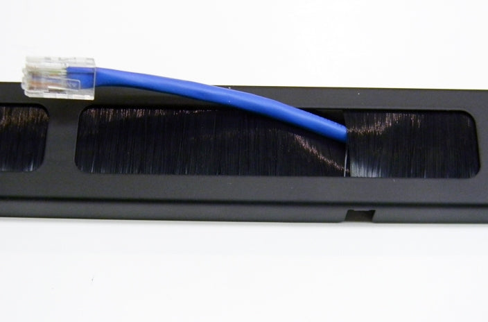 Datcom Realm 1U 19 inch wide brush style horizontal steel cable manager x .5 inches (12.7mm) deep. Diminishes unwanted airflow inside a cabinet while allowing cables to pass through.