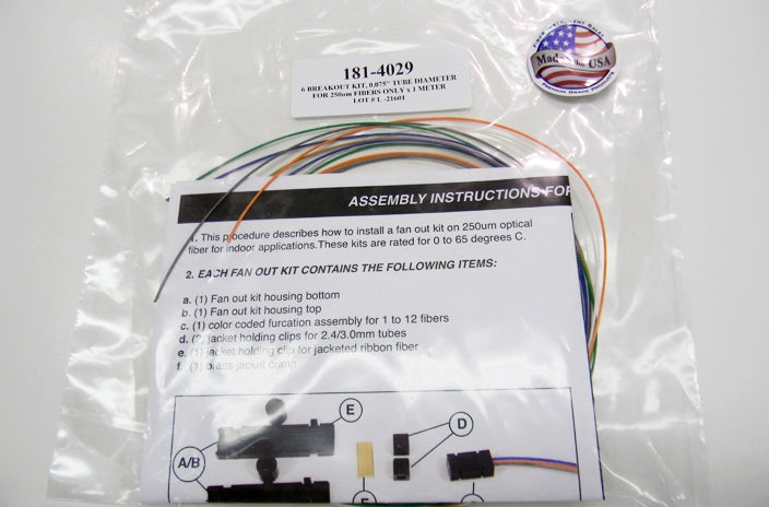 Datcom Realm 250 micron 6 fiber break out kit for 900 micron standard buffer tubes or ribbon distribution cable. Comes with 36 inch leads.