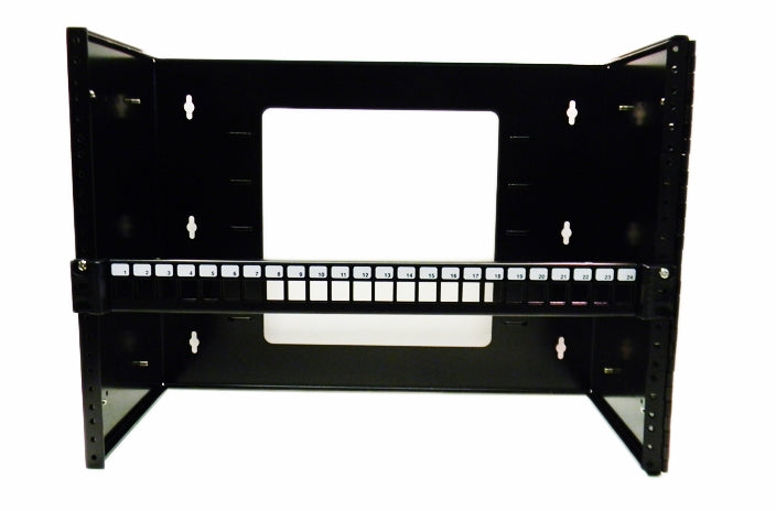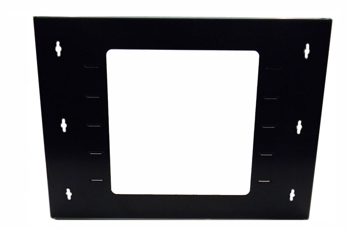 Datcom Realm' s 8U adjustable wall mount bracket is 19 inches wide x 14 inches high x 9 to 13.8 inches deep. The 8U wall mount rack comes with 6 stops for depth, tapped M6 threads, Velcro knockouts, rear opening and template. Finished in a smooth black powder coat and includes 32 M6 screws.
