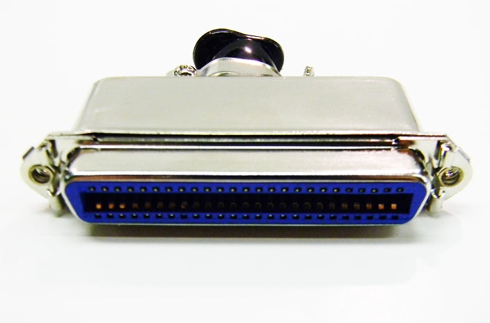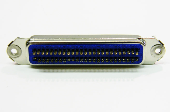 Datcom Realm Centronics 50 female solder connector with 180 degree metal cover. Comes with a strain relief and mounting screw. Ideal for 28 gauge ribbon cable.