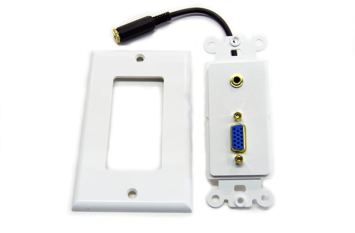 Datcom Realm 2 port single gang white decora style plate. Comes with a HD15 female to female adaptor,3.5 millimeter adapter and cover plate.