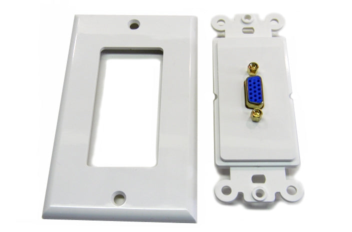 Datcom Realm 1 port single gang white decora style plate. Comes with a HD15 female to female adaptor and cover plate.