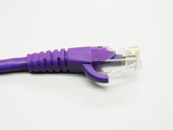 Datcom Realm 8P8C RJ45 paired Category 6 stranded purple patch cable x 25 feet. Comes with easy squeeze moulded high density low profile snag-proof boots.