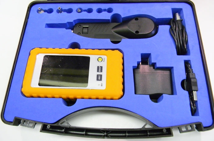 Datcom Realm fiber inspection probe for ports and connectors. Comes with inspection probe, 3.5-inch LCD monitor 12.6 volt AC/DC adapter, cleaning tools, fiber adapters and hard case.