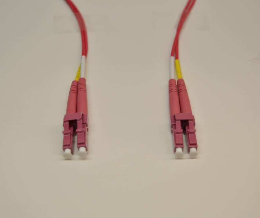 Datcom Realm LC to LC 50/125um OM4 Multimode duplex OFNR riser rated magenta coloured 2mm jacketed fiber patch cord by 7 ft. Features a duplex shrouded connector and printed test results. Maximum -.30 dB insertion loss, exceeds belcore specifications.