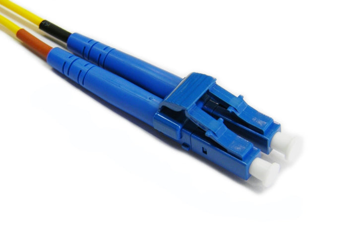 Datcom Realm LC to LC singlemode duplex zip fiber patch cord by 7 feet (2.13 meters). Comes with a 1.6 millimeter OFNR riser rated yellow jacket and printed test results.