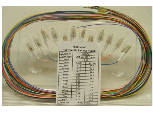 Datcom Realm LC to open end fiber optic pigtails, simplex multimode 62.5/125 OM1 x 10 feet (3 meters). Comes with a 900 micron jacket, Corning Glass and test results. The package of 12 includes the standard fiber optic colours.