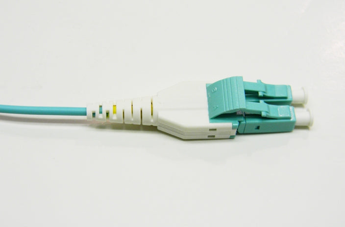 Datcom Realm LC Uniboot to LC Uniboot high density 50/125 OM4 micron single jacket 2 millimeter fiber patch cord by 3.28 feet (1 meter). Comes with an OFNR riser rated aqua coloured jacket and printed test results . Maximum -.20 dB insertion loss, exceeds belcore specifications.