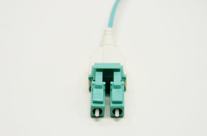 Datcom Realm LC Uniboot to LC Uniboot high density 50/125 OM4 micron single jacket 2 millimeter fiber patch cord by 6.56 feet (2 meters). Comes with an OFNR riser rated aqua coloured jacket and printed test results . Maximum -.20 dB insertion loss, exceeds belcore specifications.