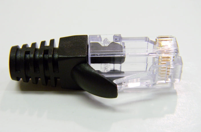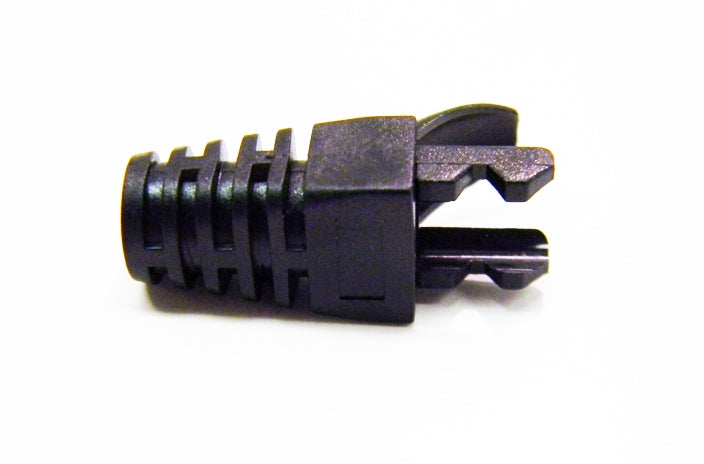 Datcom Realm low profile 7mm black strain relief boot for RJ45 connectors.The unique design allows the strain relief to be crimped with the connector, making it an integral part of the complete assembly.