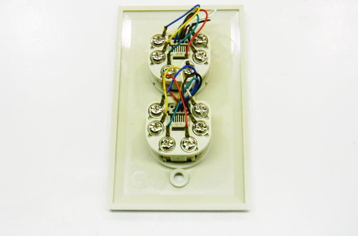 Datcom Realm RJ12 (6P6C) dual ivory screw terminal faceplate. Labeled voice and data and comes with mounting hardware.