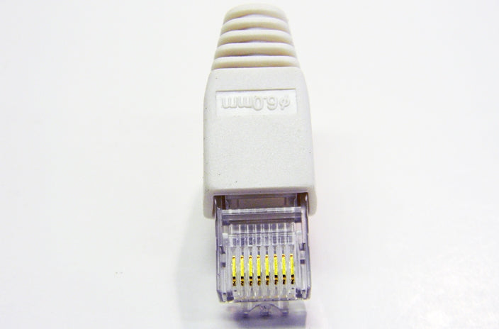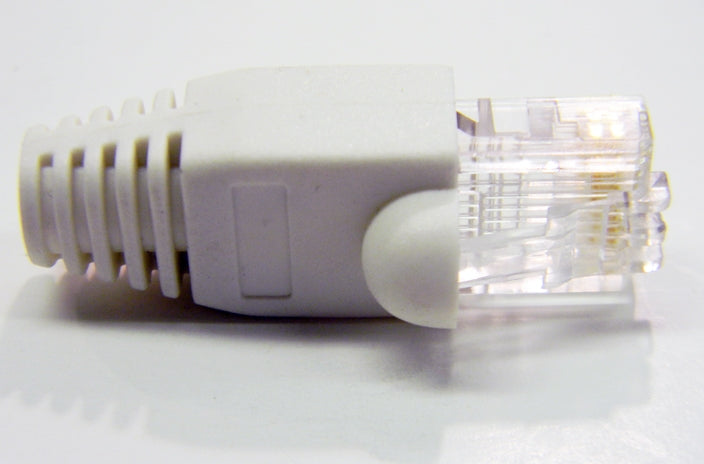 Datcom Realm RJ45 8P8C white protective boot. Can be used on a 6 millimeter cable diameter or less. RoHS compliant.