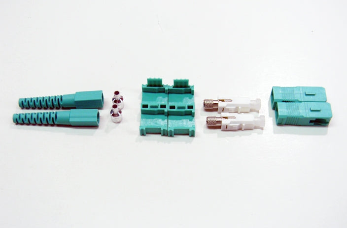 Datcom Realm SC multimode duplex fiber connector for 2 millimeter cable jacket. Comes with 126 micron ferrule, aqua housing and aqua boots.
