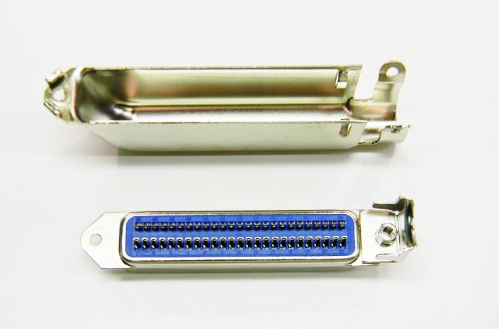 Datcom Realm telco 50 male solder connector, reversed pinned with 90 degree metal cover. Comes with a strain relief and mounting screw. Ideal for 28 gauge ribbon cable.