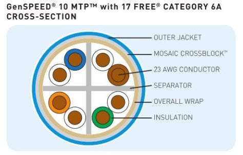 General Cable 7141823 GenSpeed  Cat6A CMP plenum 4 pair UTP 6A cable with a green jacket supports 10 GbE performance. The 7141823 category 6A 23 gauge ethernet cable provides the smallest overall diameter of .250 inches. Application: EEE 802.3: 10G BASE-T, 1000 BASE-T, 100 BASE-TX, 10 BASE-T, PoE, PoE+ and POE++. Comes on a spool.