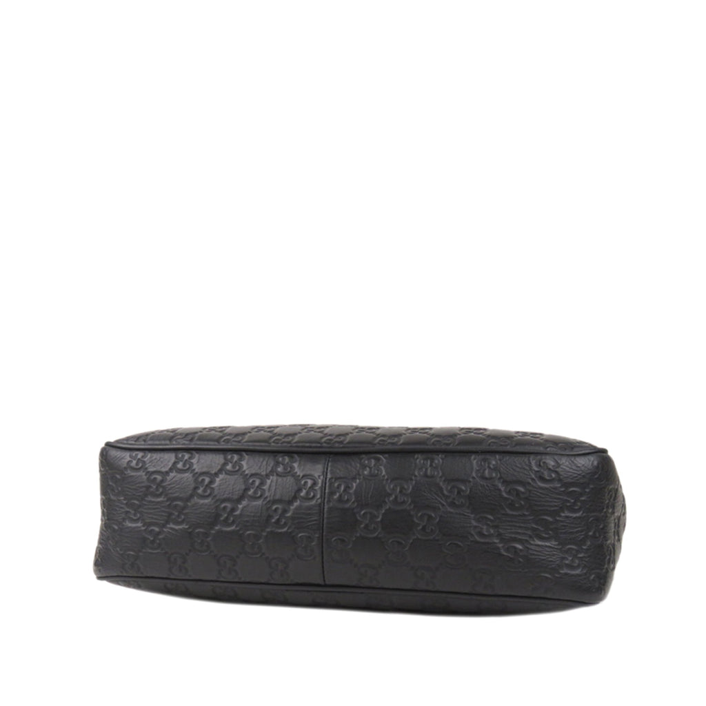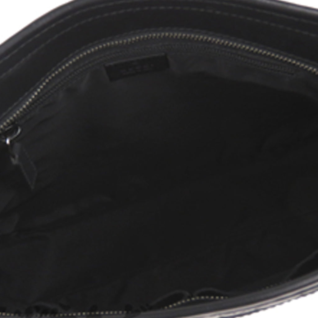 This crossbody bag features a leather body, a back exterior zip pocket, an adjustable flat strap, a top zip closure, and an interior zip pocket.