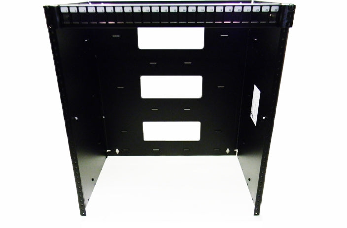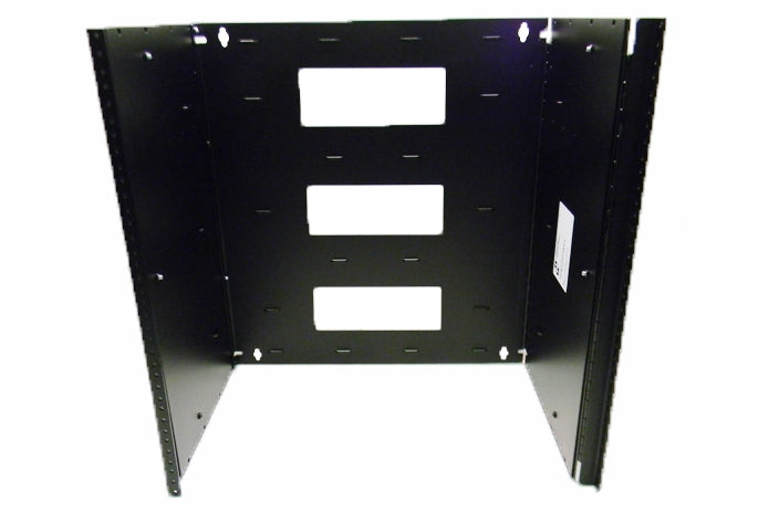 Hammond's APB19021BK1 is a 12U adjustable wall mount bracket 19 inches wide x 21 inches high x 12 inches to 18 inches deep. The APB19021BK1 comes with 10/32 tapped rails, Velcro knockouts, 3 rear openings 8 inches x 2.5 inches, rugged black textured powder coat finish and 25 black Phillips screws and template.