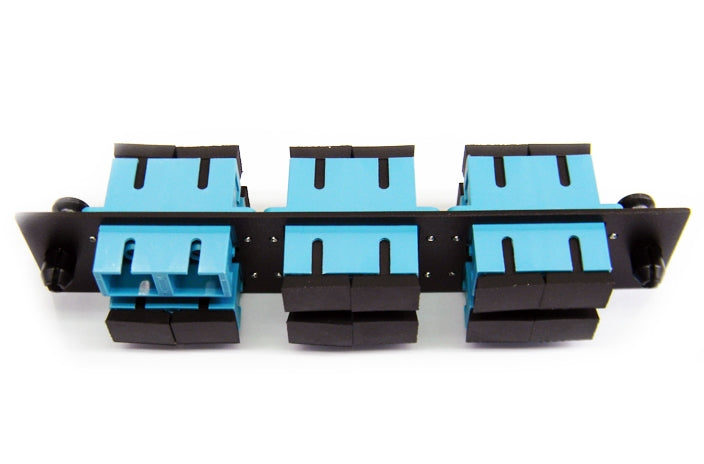 Hubbell FSPSCDS6AQ OptiChannel SC FSP fiber optic adapter panel is loaded with 6 duplex singlemode/multimode zirconia ceramic insert bulkhead connectors for a total of 12 FSP ports. The Hubbell FSPSCDS6AQ can be used with all OptiChannel FCR, FTR, FCW, and FTU enclosures. Learn more about the benefits of Hubbell's Fiber Optic products