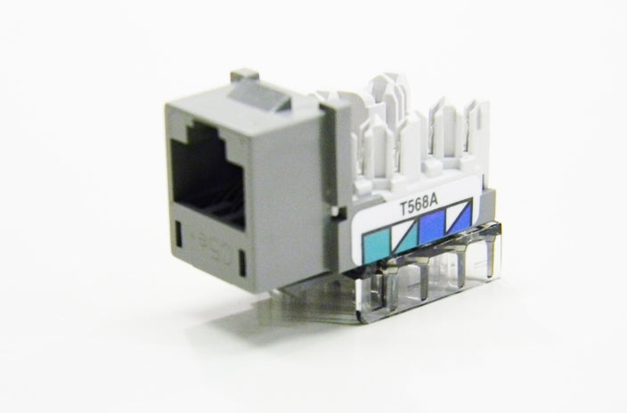 Hubbell HXJ5EGY Xcelerator RJ45 ethernet 568A/B universal modular cat5e grey keystone jack can be terminated with a 110 IDC punch down tool or toolless termination. The HXJ5EGY Hubbell RJ45 jack is the first modular jack to undergo extreme DTE Power testing to 4x the standard handling continuous DTE Power, exceeding the IEEE 802.3af standard without failure or any substantial temperature increase. Hubbell’s cat5e data wall jack supports 10/100/1000 Base-T applications. Learn More about benefits of Hubbell Jack.