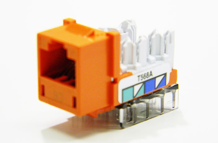 Hubbell’s HXJ6OR25 NextSpeed RJ45 ethernet 568A/B universal cat6 orange keystone jack can be terminated with a 110 IDC punch down tool or toolless termination. The HXJ6OR25 cat6 keystone jack also features being the industry's first tested category 6 component compliant jack. The port contacts material is beryllium copper with a minimum of 50 micro-inches of gold plating over nickel under plating and the 110 punch down contacts material is a phosphor bronze with 100 micro-inches of tin lead 60/40 plating over nickel under plating. Accommodates 26-22 AWG Cable and the 25 pack reduces excess waste on the job. Learn More about benefits of Hubbell Jack.