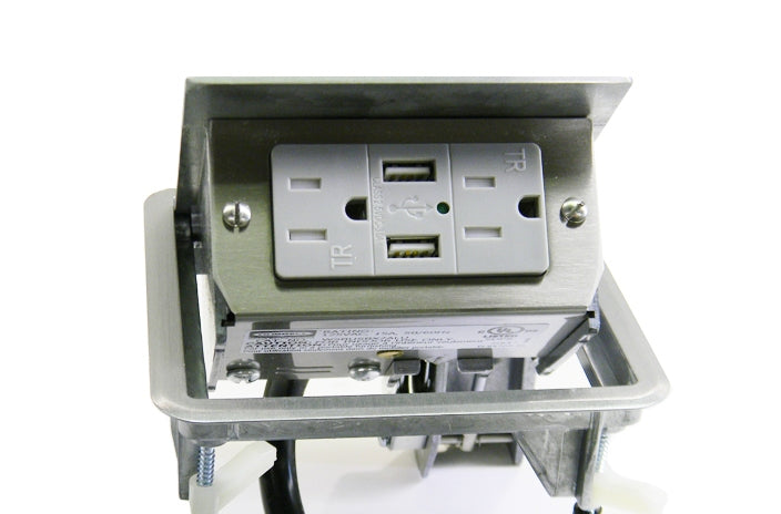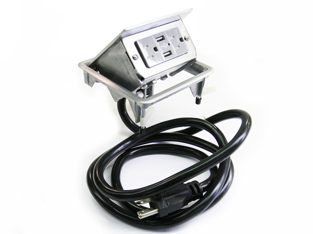 Hubbell WSBUSB2X2ALU 2x2 USB work surface brushed aluminum pop up box. Comes with two 125V receptacles plus two 3 Amp USB charging ports and 5 foot pre-wired, 12 gauge, 3 wire electrical cord. The Hubbell WSBUSB2X2ALU Pop-Up Box utilizes a pneumatic spring for providing a smooth action for opening and closing.