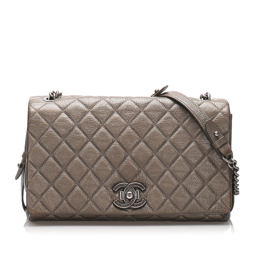 This shoulder bag features a lambskin leather body, a silver-tone chain strap, a front flap with CC push lock closure, and interior slip pockets.