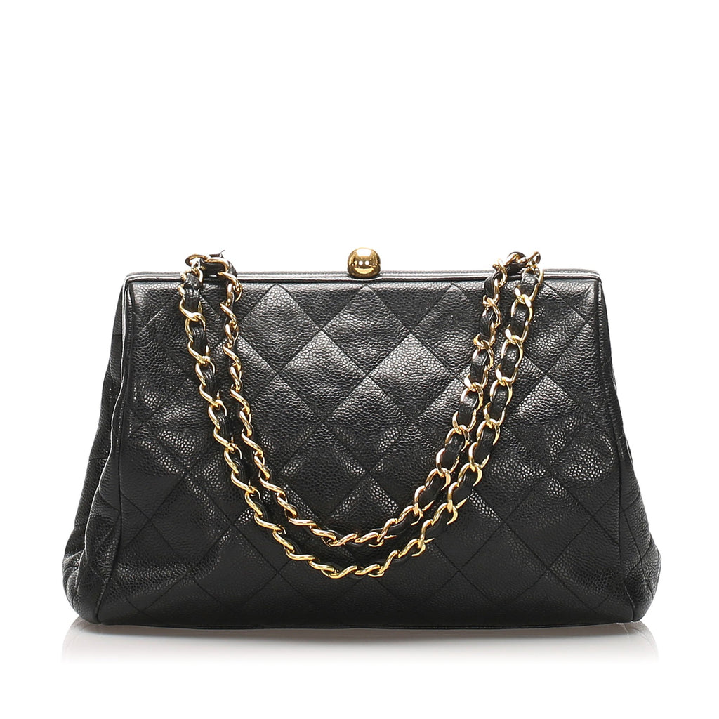 This shoulder bag features a caviar leather body, a gold-tone leather woven chain strap, a top kiss lock closure, and interior zip pocket.