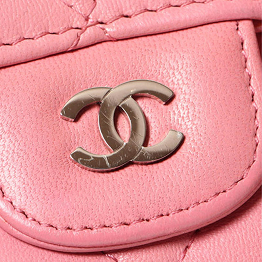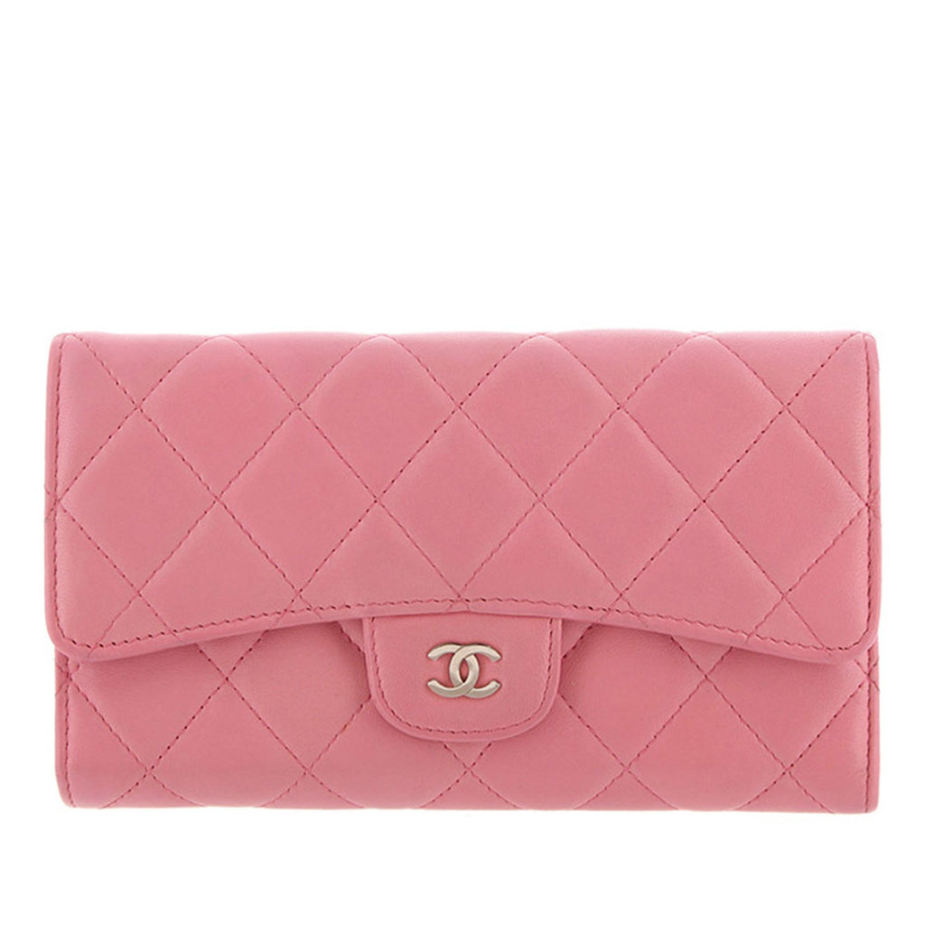 This wallet features a quilted leather body, top flap with snap button closure, exterior slip pocket, and interior slip and flap pockets.