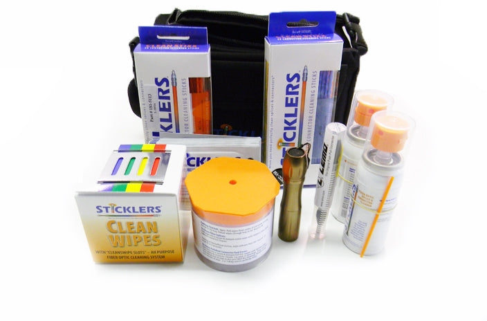 Microcare Sticklers fiber optic military and broadcast cleaning kit consists of a weather-resistant polyester bag, Lemo alignment tool for SMPTE connectors, 2 cans of cleaner fluid,1 mini-tub of benchtop cleanwipes, 1 Cleanwipe 400 cleaning tool, 1 packet of 25 cleanwipes singles for use in harsh environments, 50 different sizes of Cleanstixx swabs, 50 swabs for 2.0mm and 1.6mm connector and a high intensity LED inspection flashlight.