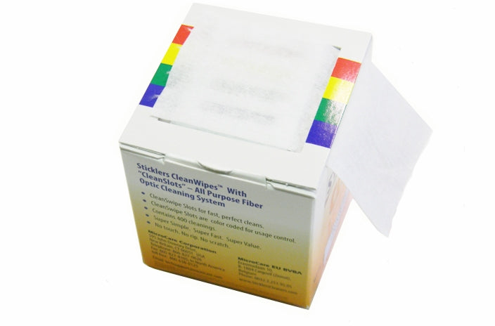 Microcare Sticklers WCS100 benchtop fiber optic cleanwipes are high quality, lint-free wipes engineered for use on bare fiber before splicing and also for cleaning fiber optic patch cables. Contains 400 perforated lint-free wipes, each wipe being 4 inches x 2 inches 10 cm x 5 cm).
