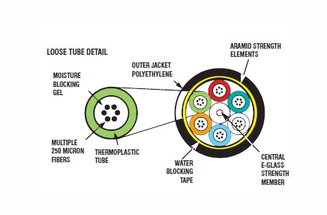 - Each individual 6 fiber group is protected with a coloured PBT jacket and cabled around a rigid epoxy fiberglass central strength member which provides superior protection against thermal expansion.