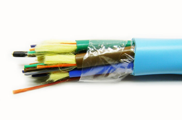 Mohawk M9C602 Advancelite 50/125 micron multimode OM3, 24 fiber round distribution,4 subunits of 6 fibers each, UL TYPE OFNR/cUL OFN FT4 riser rated aqua jacket. Mohawk's M9C602 complies with TIA/EIA-568-B.3 & provides 1000 meter (@850nm) & 600 meter (@1300nm) link for gigabit ethernet. Spool.