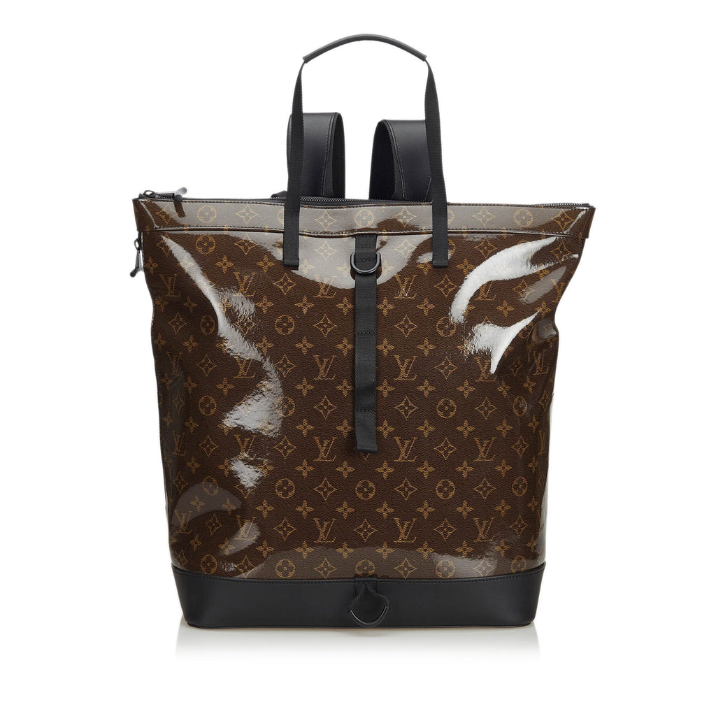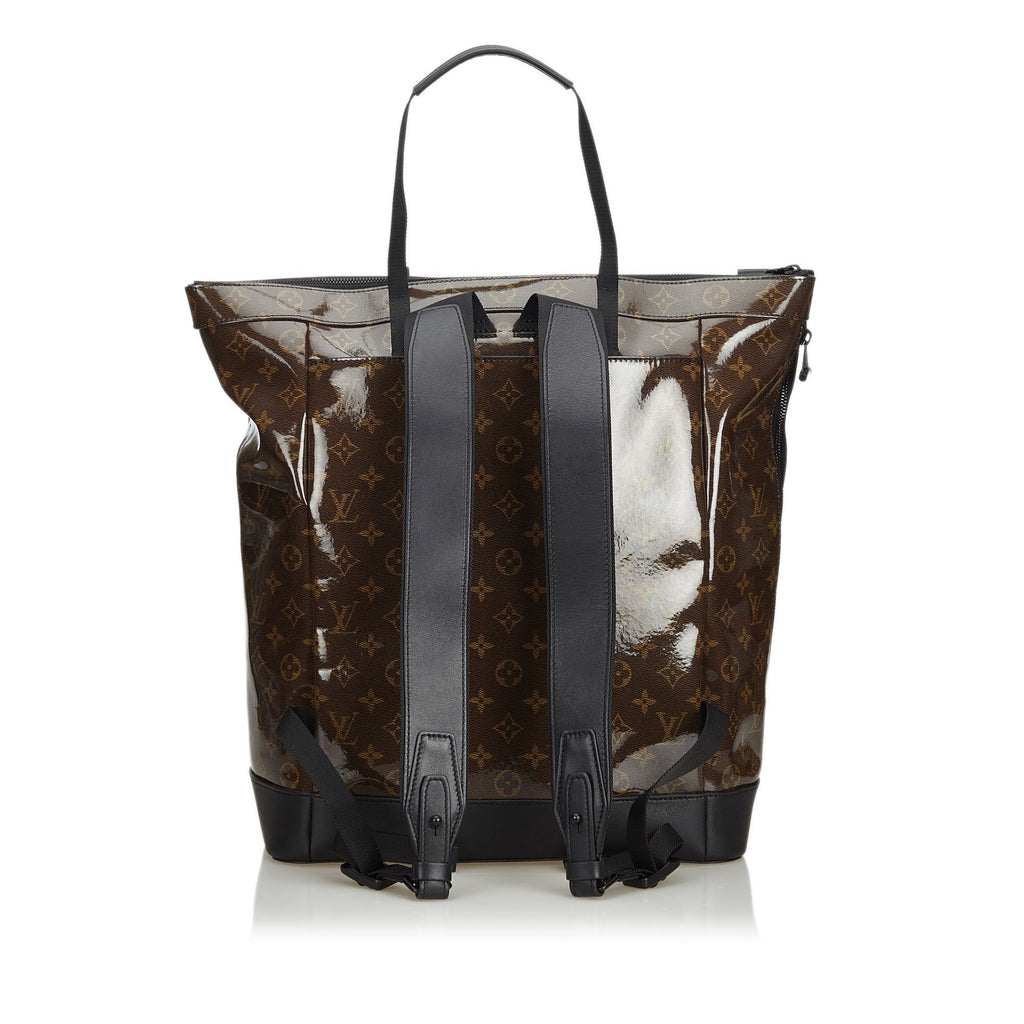 The Monogram Glaze Backpack features a coated canvas body with leather trim, a back exterior slip pocket, a flat top handle, flat leather back straps, a top zip closure, and interior zip and slip pockets.