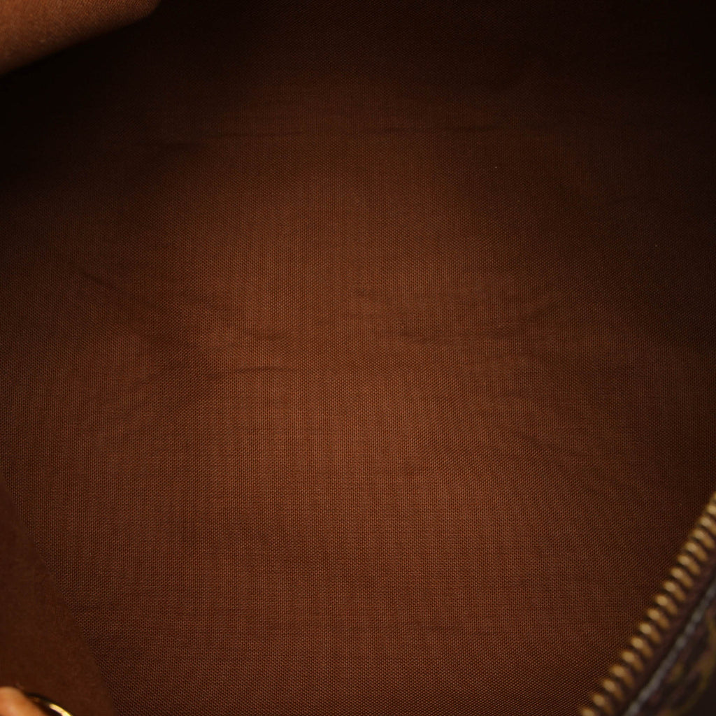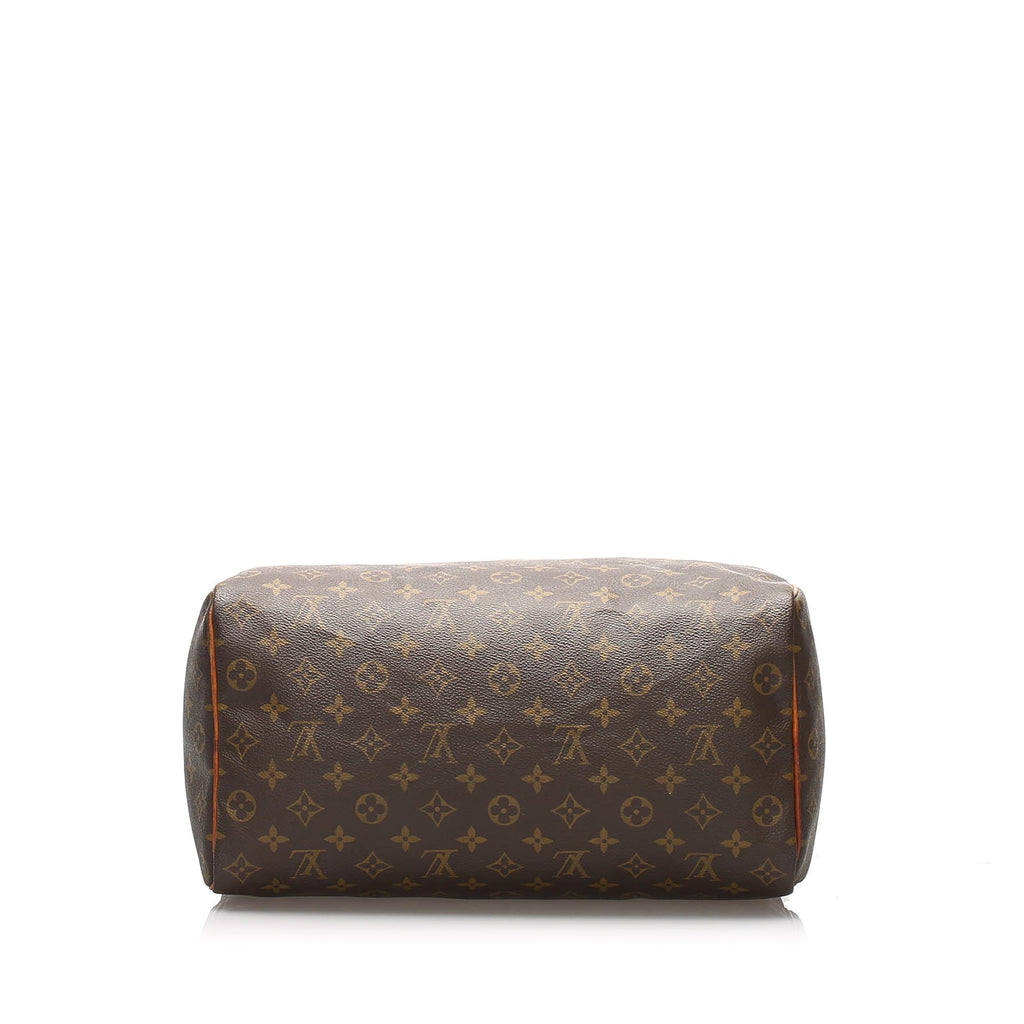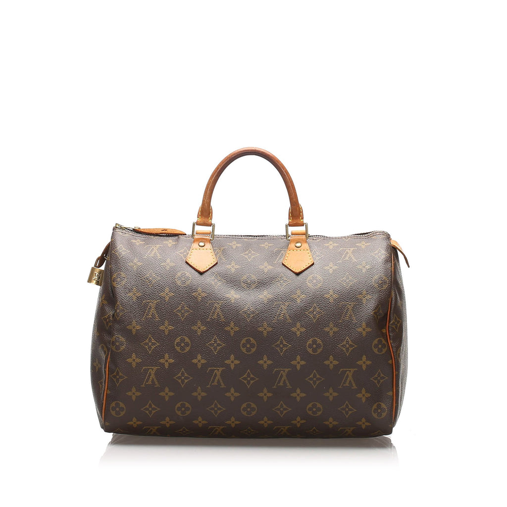 The Speedy 35 features a monogram canvas body, rolled vachetta leather handles, a top zip closure, and an interior pocket.