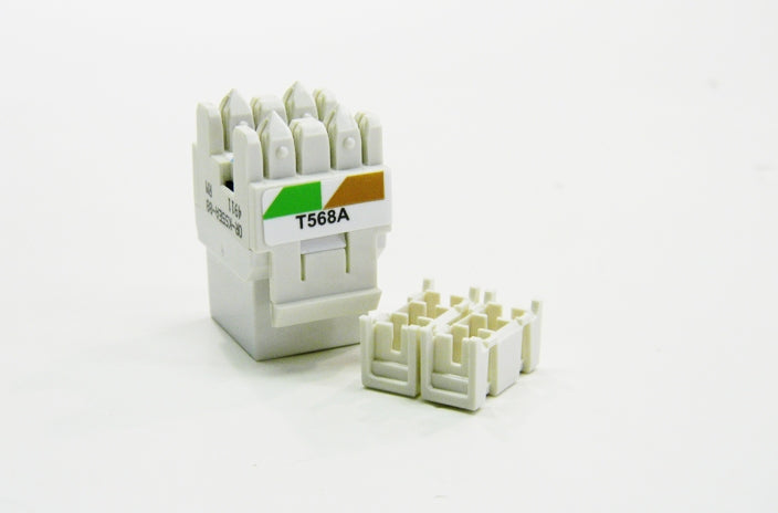 Ortronics TechChoice OR-KS5EA-88 RJ45 ethernet 568A/B universal modular cat5e cloud white keystone jack can be terminated with a 110 IDC punch down tool. The Ortronics TechChoice OR-KS5EA-88 8-position, 180 degree exit, icon compatible. The Ortronics TechChoice cat5e keystone jacks and modules feature an easy-to-follow universal wiring label and support standard termination. The keystone footprint allows for the greatest flexibility in installation scheduling because its rear insertion into the faceplate allows the technician to complete the termination before and during the construction process.