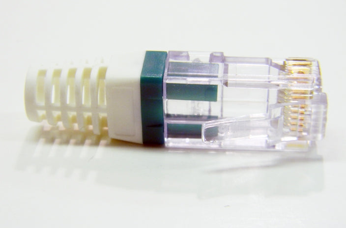 Platinum Green strain relief is designed specifically for the EZ-RJ45 category 6 connector. The unique design allows the strain relief to be crimped with the connector, making it an integral part of the complete assembly.
