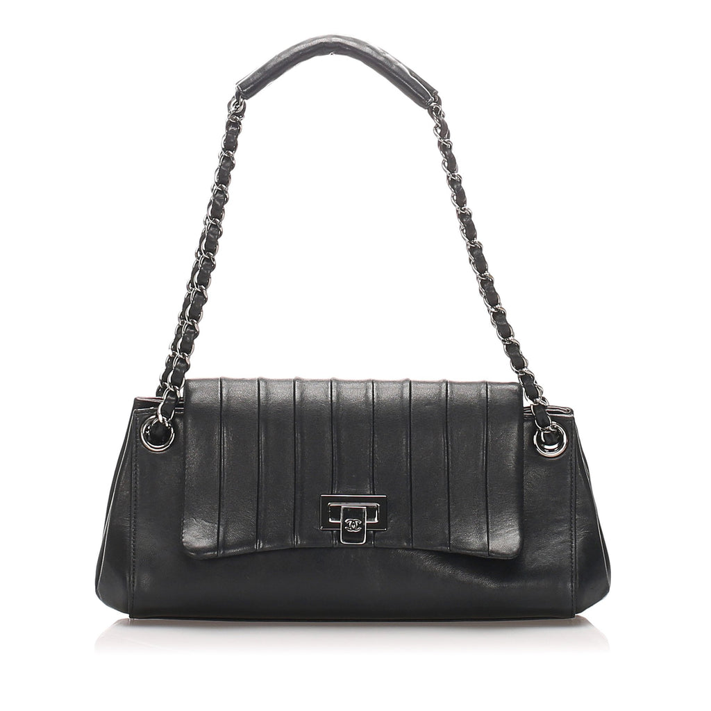 This shoulder bag features a lambskin leather body, curb chain straps, a front flap with a twist lock closure, and interior zip and slip pockets.
