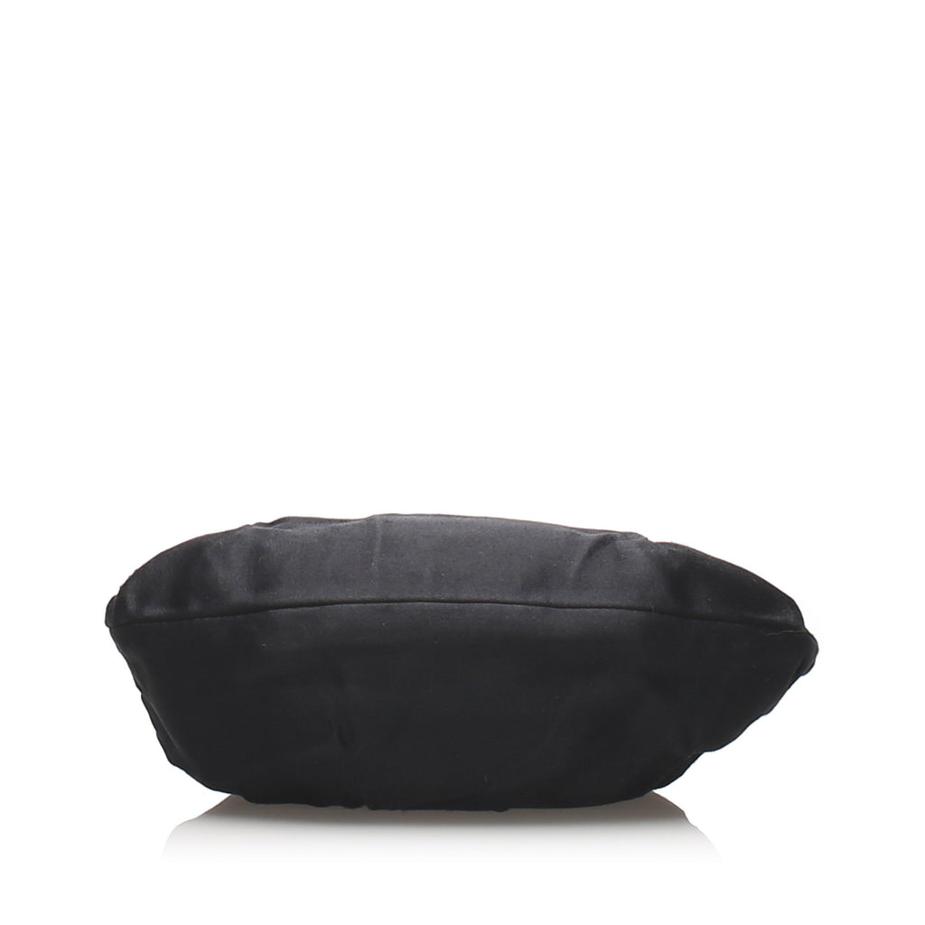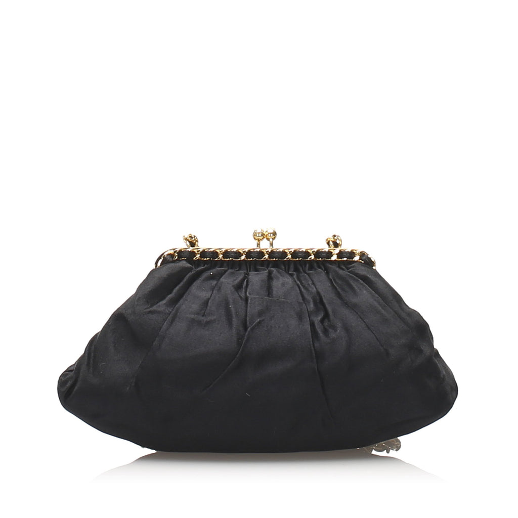 This crossbody bag features a satin body, a woven chain strap, and a kiss lock closure.