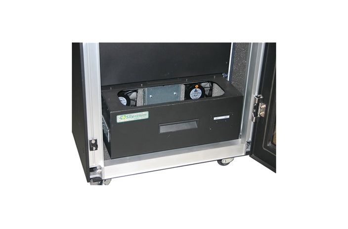 Silentium AcoustiRACK sound proof dark grey black cabinet is 19 inch rack mountable, useable height is 15U.External dimensions are 44.88 inches high x 23.62 inches wide and 45.28 inches deep.Comes with two Active Noise Control fan modules, casters, 2 sets of adjustable square hole rails, side panels,glass front door and rear doors with locks and ships assembled.